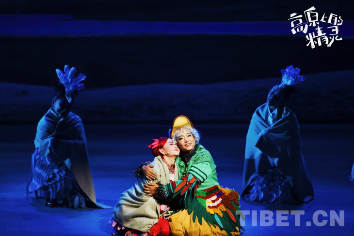 故事對“生態(tài)保護”的詮釋深刻且包容。它未將環(huán)境惡化歸咎于某一族群,而是通過母湖嚴(yán)寒、子湖干旱的對比,展現(xiàn)“生態(tài)系統(tǒng)無邊界”的現(xiàn)實:黑頸鶴需潔凈湖水,藏野驢需豐茂草原,均依賴子母湖的自然循環(huán)。當(dāng)牦牛族用身軀為風(fēng)雪中的鳥類擋寒,藏羚羊與黑頸鶴在重建的湖岸并肩眺望,舞臺上呈現(xiàn)的不僅是劇情的和解,更是對“團結(jié)協(xié)作守護家園”理念的生動演繹。劇中傳遞的協(xié)作精神,跳出了“人類中心”或“生態(tài)中心”的二元對立,體現(xiàn)了西藏傳統(tǒng)生態(tài)觀的系統(tǒng)性思維——保護珍稀物種是所有生命休戚與共的必然選擇,人與自然應(yīng)是和諧共生的有機整體。