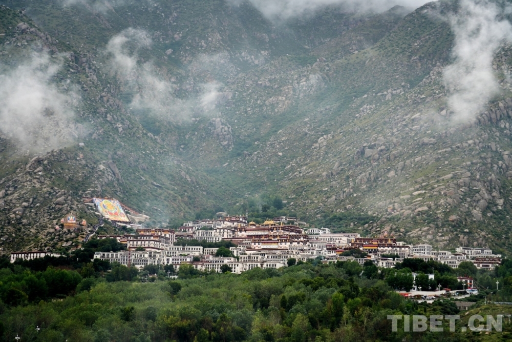 圖為遠(yuǎn)眺哲蚌寺展佛與哲蚌寺全景 攝影:馮重霖