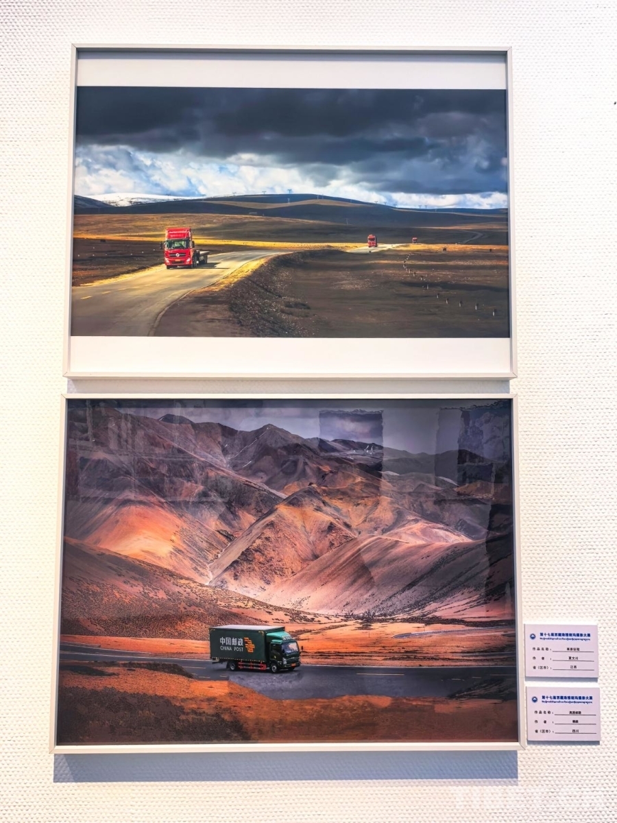 圖為第十七屆西藏珠穆朗瑪攝影大展所展出的《草原征程》(上方 攝影:夏文川)《高原郵路》(下方 攝影:賴毅)