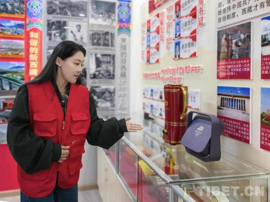 在社區(qū)回憶館內(nèi),有一排展柜精心展出了歷年來中央代表團(tuán)贈(zèng)予西藏各族各界干部群眾的禮物。從西藏自治區(qū)成立三十周年時(shí)的鐘表,到西藏自治區(qū)成立六十周年時(shí)的全自動(dòng)酥油茶壺,德吉措姆說這些禮物滿載著黨中央對(duì)西藏各族群眾深情厚誼,每一件禮物都是當(dāng)時(shí)各族群眾日常生活所切實(shí)需要的,禮物的變化也見證著西藏各族群眾生活的變化。