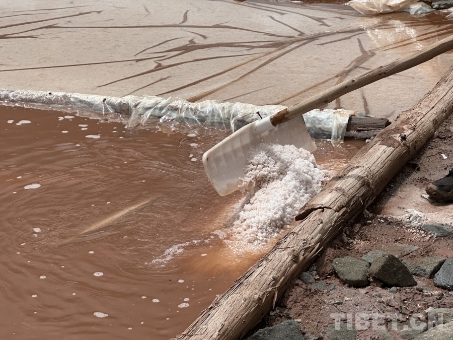 白扎鹽場(chǎng)出產(chǎn)的鹽有白鹽與紅鹽兩種,圖為江羊巴桑正在向我們展示白鹽的制取過(guò)程??梢钥吹?,盡管鹵水呈現(xiàn)較深的紅褐色,但初步制取的鹽仍然呈現(xiàn)雪白的顏色。攝影:畢然