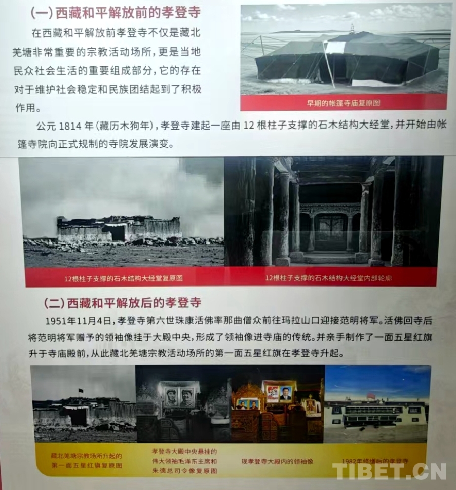 走進(jìn)孝登寺,主殿正中央懸掛的領(lǐng)袖像莊嚴(yán)醒目。據(jù)孝登寺管委會(huì)副書(shū)記、主任羅布旺秋介紹,1951年,范明將軍率解放軍途經(jīng)那曲時(shí),六世珠康活佛力排眾議前往馬拉山迎接。范明將軍向僧眾宣講黨的民族宗教政策,并向六世珠康活佛贈(zèng)送了毛主席和朱總司令畫(huà)像。此后,六世珠康活佛將領(lǐng)袖像敬懸于大殿正中,這一傳統(tǒng)延續(xù)至今。他還親手制作并升起了藏北寺廟中的第一面五星紅旗。