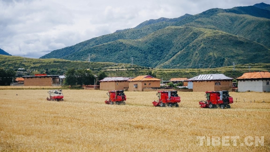圖為機(jī)械化青稞收割現(xiàn)場