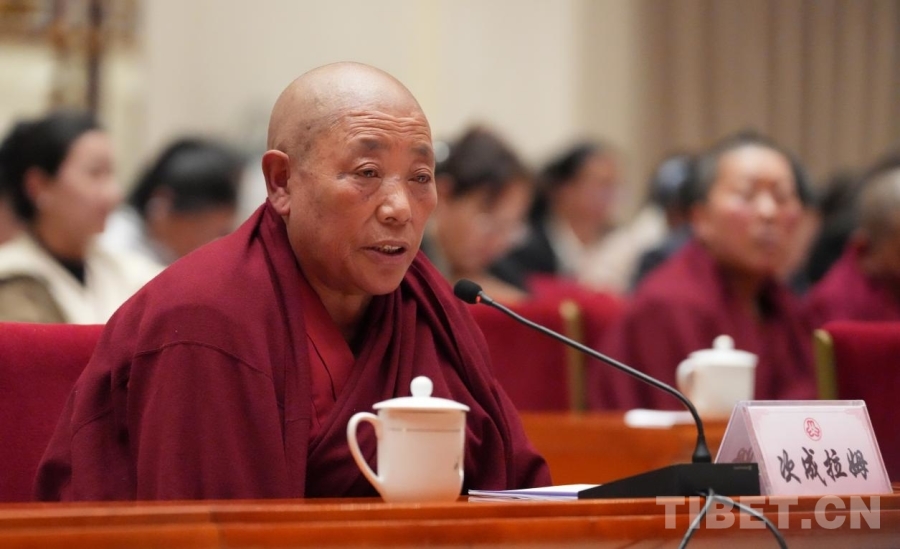 圖為拉薩市倉姑寺寺管會副主任次成拉姆發(fā)言