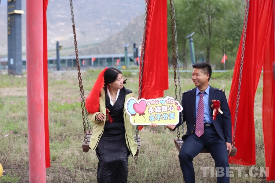 在全場來賓的祝福中,兩對身穿鐵路制服和民族服飾的新人成為本次集體婚禮的耀眼主角,在現(xiàn)場同事的見證下,在拉薩地區(qū)特有的藏戲祝福聲中,完成了一場終生難忘的儀式。新人王克龍與武春燕并肩坐在秋千上,目光緊緊相依;愛情長廊中,另一對新人張慶強與蔡雨欣共同掛上同心鎖。