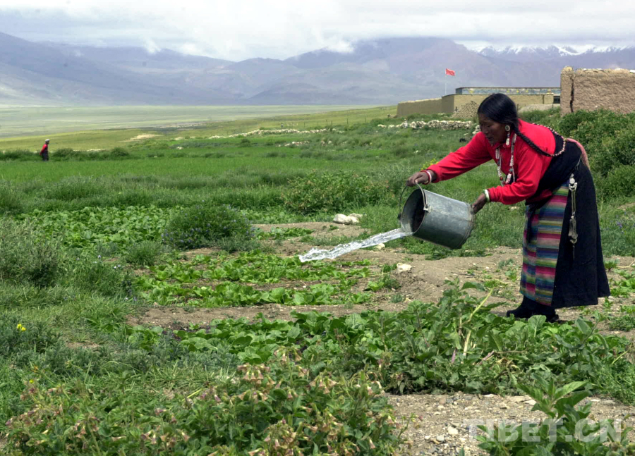 這是在尼瑪縣文部鄉(xiāng)南村的當(dāng)惹雍錯湖畔,一位藏族婦女在為蔬菜澆水(唐召明2001年攝)