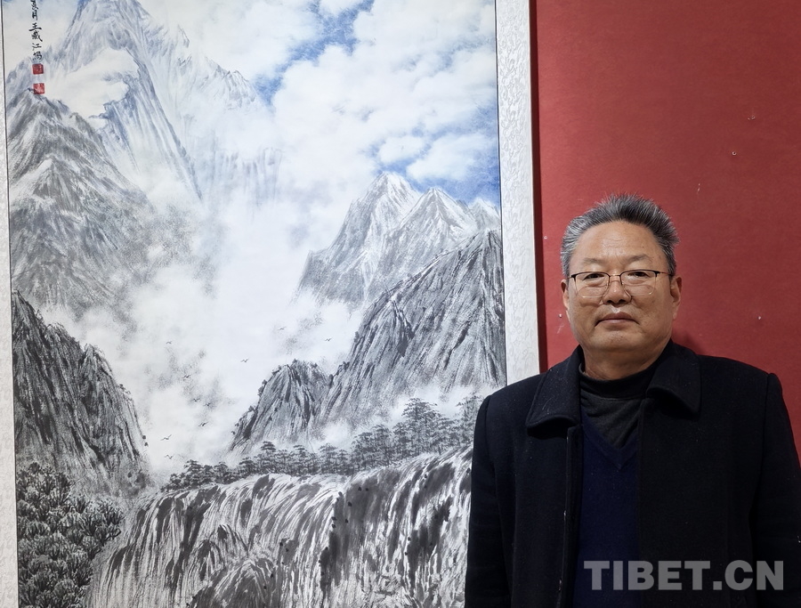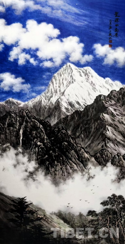 走進(jìn)王藏江位于四川成都家中的畫室,碧空如洗、白云悠游、雪峰巍峨、峽谷深邃、布達(dá)拉宮聳立山巔……雄渾的高原風(fēng)情撲面而來,氣勢(shì)磅礴的國畫令人頓感胸襟開闊,仿佛置身高天厚土的西藏。