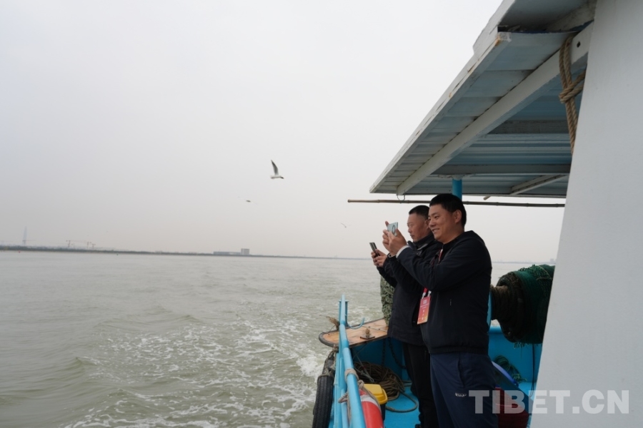 圖為西藏基層干部學(xué)習(xí)參觀團(tuán)成員在船上拍攝海景 攝影:王茜