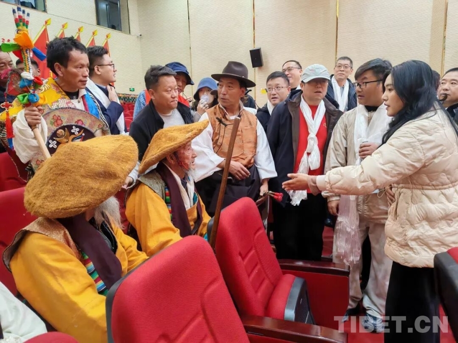 在南木林縣湘巴文化藝術(shù)中心內(nèi),南木林鎮(zhèn)雪藏戲隊的演員們頭戴色彩鮮艷的五彩面具,將經(jīng)典藏戲《智美更登》選段演繹得蕩氣回腸。高亢唱腔極具穿透力,粗獷又滿含張力的舞步踏在舞臺上,每一步都踩出湘巴藏戲的獨特韻味。接著,《格薩爾說唱》的雄渾敘事、《土布加諧慶》的歡快韻律、《扎木念》的悠揚曲調(diào)一一上演,一場非物質(zhì)文化遺產(chǎn)的盛宴令調(diào)研組成員陶醉。他們的手機(jī)鏡頭緊緊追隨演員,將精妙的表演、動人的唱腔定格。表演間隙,調(diào)研組的藝術(shù)家們與演員圍坐在一起,圍繞表演技巧展開深入交流,探討唱腔中氣息的綿長運用,研究舞步里節(jié)奏的細(xì)微變化。在思想的碰撞中,藏戲藝術(shù)的傳承創(chuàng)新脈絡(luò)愈發(fā)清晰。