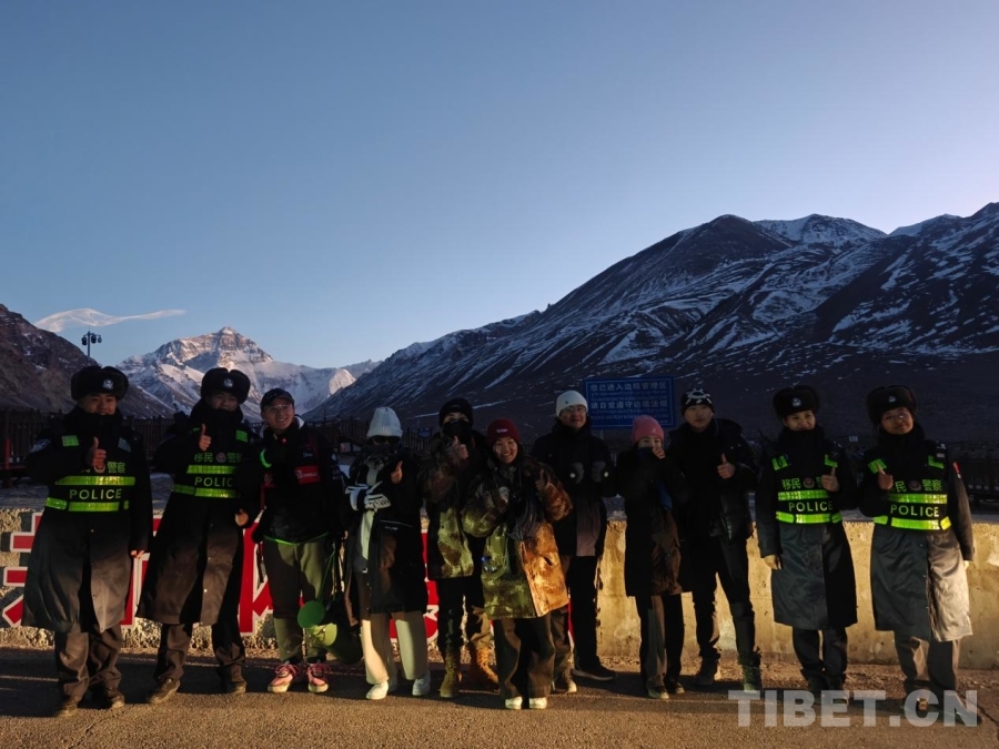 圖為傍晚時分民警與游客在珠峰腳下合影留念