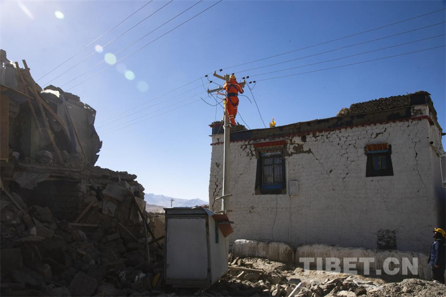 圖為地震發(fā)生第三日,在定日縣長(zhǎng)所鄉(xiāng)森嘎村國家電網(wǎng)工作人員為受災(zāi)群眾安置點(diǎn)恢復(fù)電力供應(yīng)(攝于2025年1月9日) 攝影:趙振宇