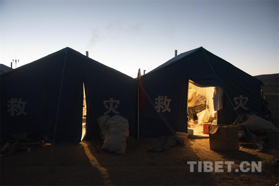 圖為地震發(fā)生第四日,夜幕即將降臨之時(shí)定日縣長(zhǎng)所鄉(xiāng)雜村受災(zāi)群眾安置點(diǎn)內(nèi)救災(zāi)帳篷中泛起暖光(攝于2025年1月10日) 攝影:趙振宇