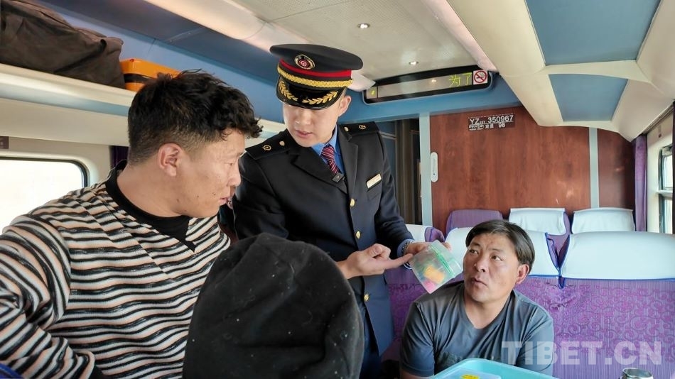 圖為乘務(wù)員用漢語、藏語、英語播報乘車注意事項 攝影:陳衛(wèi)國