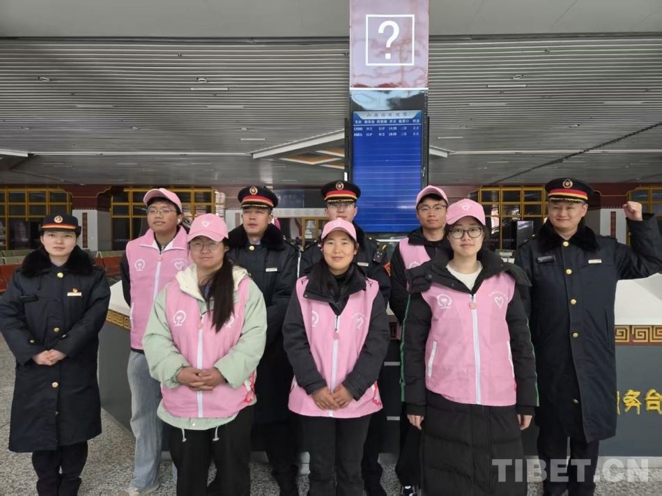 圖為拉薩車(chē)站工作人員和志愿者護(hù)航旅客平安春運(yùn)