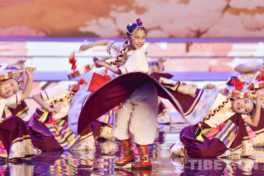 圖為2026拉薩藏晚節(jié)目少兒舞蹈《鼓舞新時(shí)代》丹增珍美(中)與小伙伴一起為大家?guī)砭薀岚臀琛z影:趙振宇