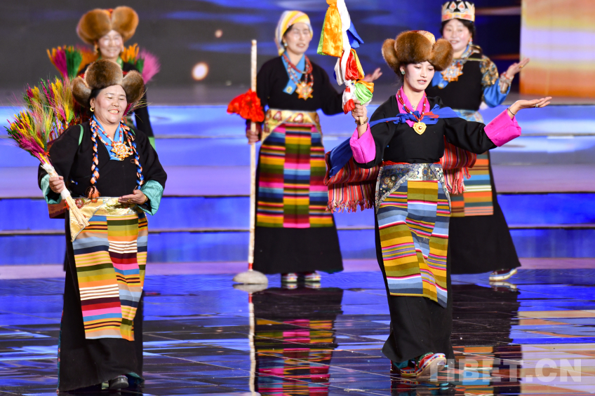 圖為2026拉薩藏晚節(jié)目《村“T”服飾秀》阿佳央金(左)與村民一起為大家?guī)砭蕚鹘y(tǒng)走秀 攝影:趙振宇