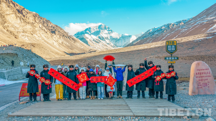新春佳節(jié)來臨之際,雪峰巍巍。在海拔五千多米的珠峰大本營(yíng),西藏邊檢總站日喀則邊境管理支隊(duì)珠峰邊境派出所的民警,與來自天南地北的游客圍聚在一起。寒風(fēng)中飄起溫暖的哈達(dá),一聲聲“扎西德勒”伴著“新年好”,在離天空最近的地方交匯成真摯的祝愿。(中國(guó)西藏網(wǎng) 通訊員/葉軼)