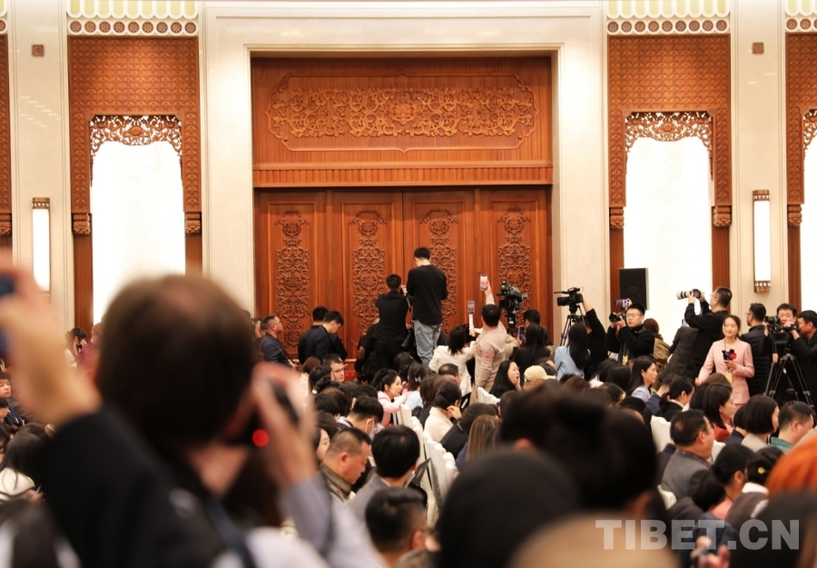 3月3日下午,全國政協(xié)十四屆四次會議新聞發(fā)布會開始前,記者們對準(zhǔn)大會新聞發(fā)言人劉結(jié)一即將進入的新聞發(fā)布廳大門。攝影:劉莉