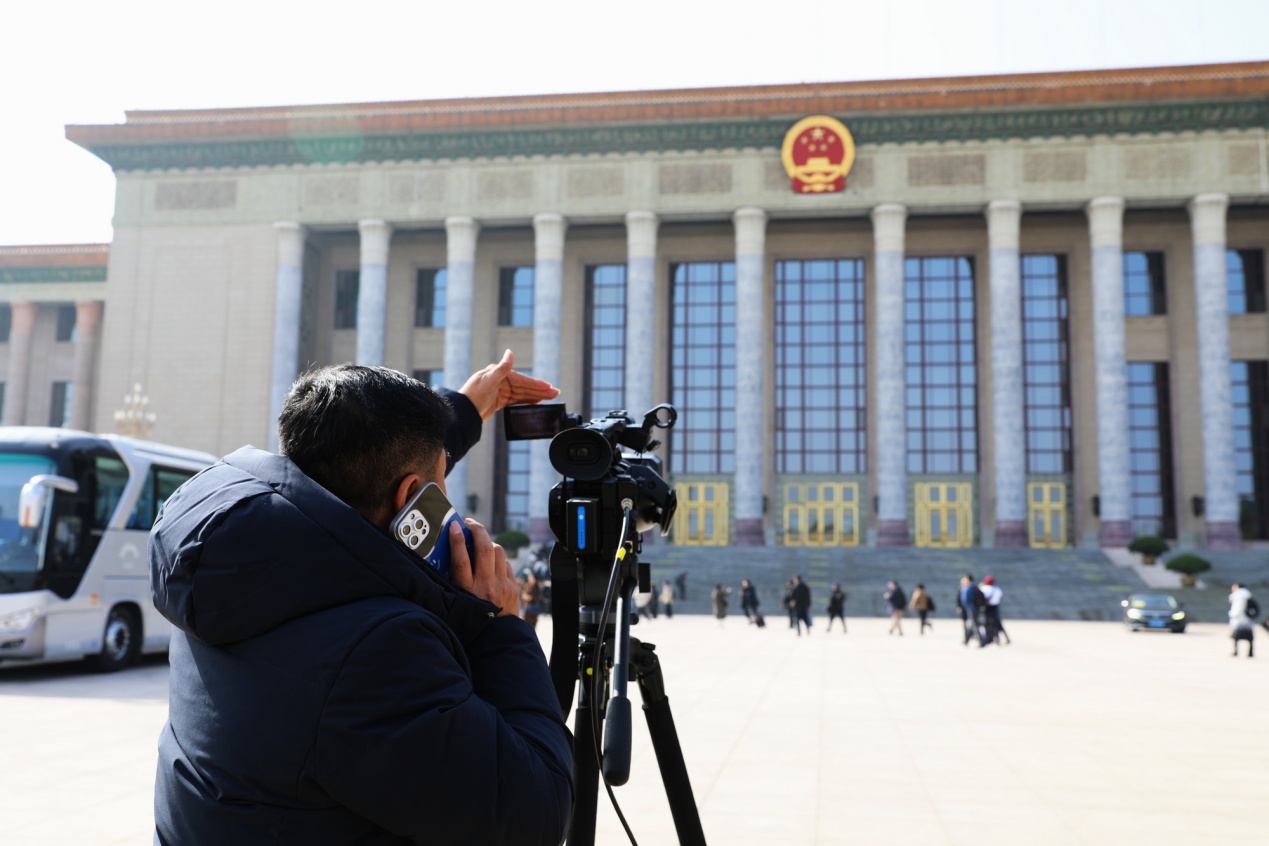 3月3日下午,本網記者在人民大會堂前,準備參加全國政協(xié)十四屆四次會議新聞發(fā)布會。攝影:劉莉