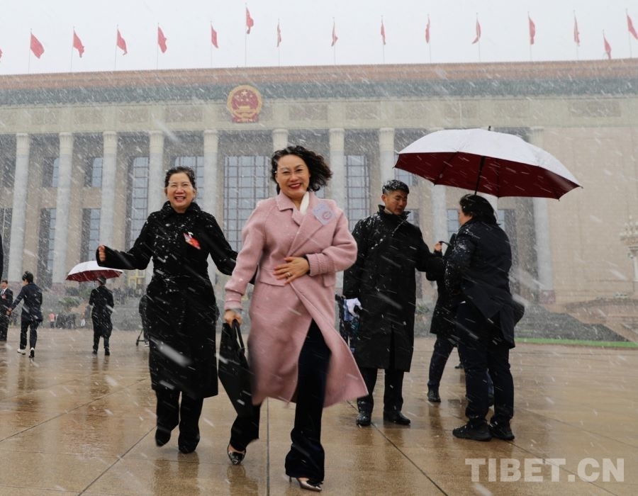3月4日上午,十四屆全國人大四次會議舉行預備會議。會后,一場春雪不期而至。走出會場的全國人大代表、廣西金秀瑤族自治縣桐木中學副校長梁麗斌向記者們揮手致意。