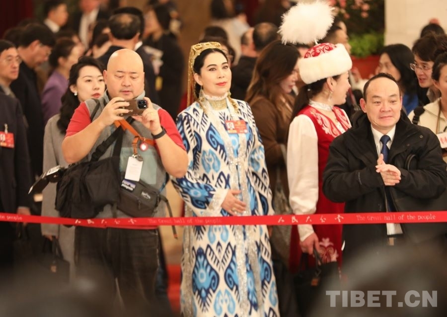 3月5日上午,首場“代表通道”集中采訪活動在人民大會堂舉行。全國人大代表、新疆維吾爾自治區(qū)少數(shù)民族古籍保護研究中心副編審米娜瓦爾·艾比布拉(前排左二)旁聽代表發(fā)言。