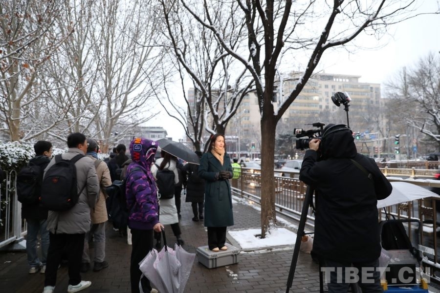 3月5日清晨,記者們在人民大會堂外播報新聞。
