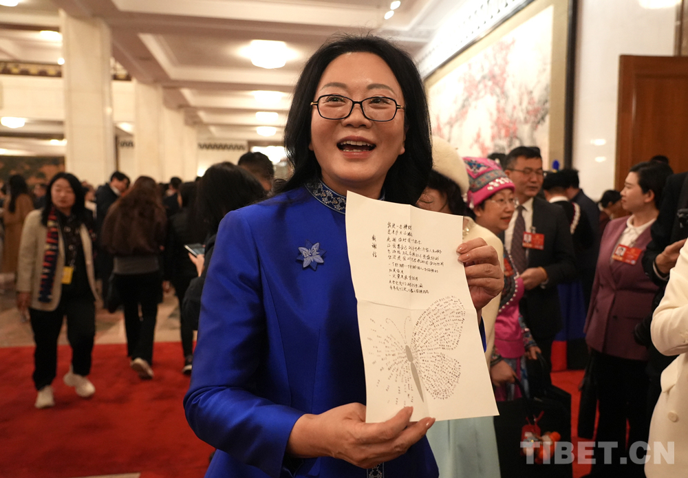 全國人大代表、依文·中國坊創(chuàng)始人夏華向記者展示貴州繡娘寫給她的感謝信