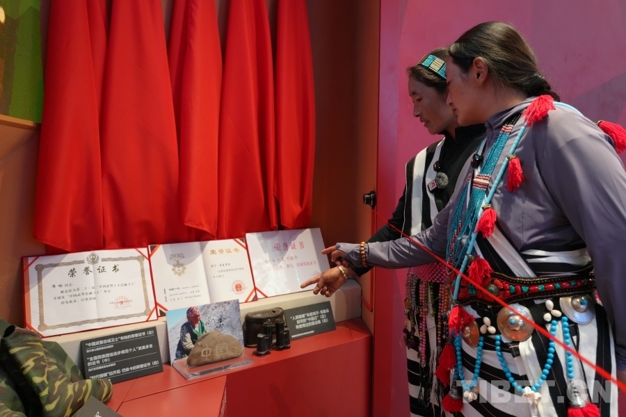 來(lái)自山南邊境的護(hù)邊員在民族文化宮看展時(shí)指著展品說(shuō):“我們?cè)谘策呑o(hù)邊途中也會(huì)在石頭上刻下祖國(guó)的名字。” 攝影:王茜