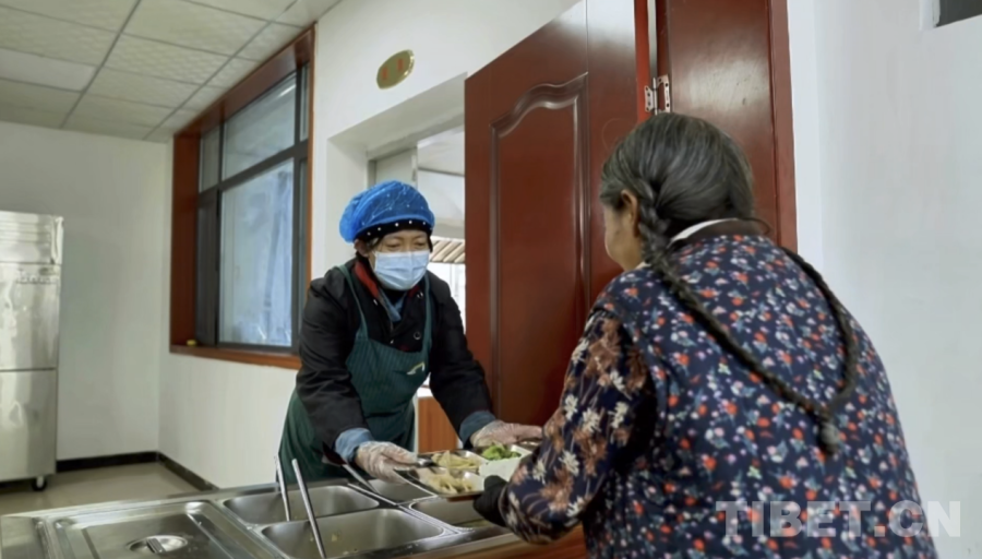 日土縣老年人日間照料中心工作人員為老人遞上豐富、可口的飯菜