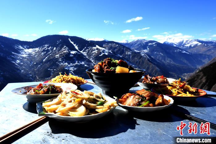 正午時分,紅燒牦牛筋、臘肉香腸、紅苕稀飯等一道道菜肴,從一間農(nóng)家小屋里新鮮出爐,端到海拔3200多米的懸崖旁的方桌上。四川省阿壩州小金縣麻足寨,天藍(lán)如洗,幽谷新雪,冬日暖陽下,白云似觸手可及。甘家溝村扶貧第一書記張飛如常打開手機,用短視頻記錄下“云端餐廳”村民用餐的場景。