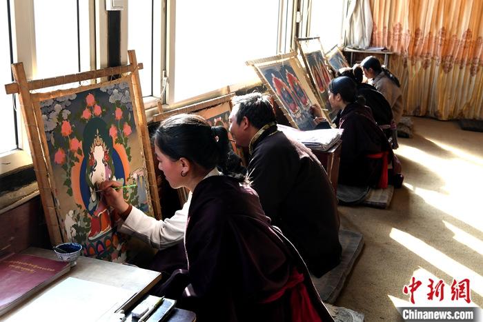 圖為1月13日,唐卡畫師們在繪制唐卡。中新社記者 安源 攝