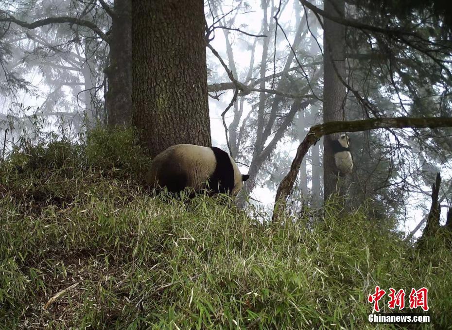 大熊貓媽媽在樹(shù)下時(shí)而愜意地?fù)习W癢,時(shí)而愉快地蹭蹭嗅味樹(shù)。半歲左右的大熊貓寶寶,像一顆糯米團(tuán)子粘在不遠(yuǎn)處的樹(shù)干上。四川臥龍國(guó)家級(jí)自然保護(hù)區(qū)管理局供圖