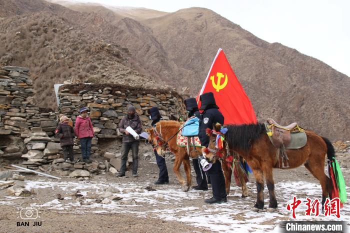 圖為馬背巡邏隊(duì)在轄區(qū)內(nèi)為牧民贈(zèng)送口罩、發(fā)放藏漢雙語宣傳資料?!≡魈m周 攝