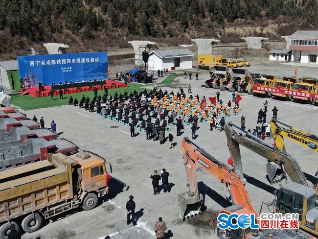 3月5日,西寧至成都鐵路四川段啟動建設,在積雪覆蓋的川西高原,當?shù)厝罕姶┥厦褡宸b,載歌載舞,表達喜悅和歡欣。