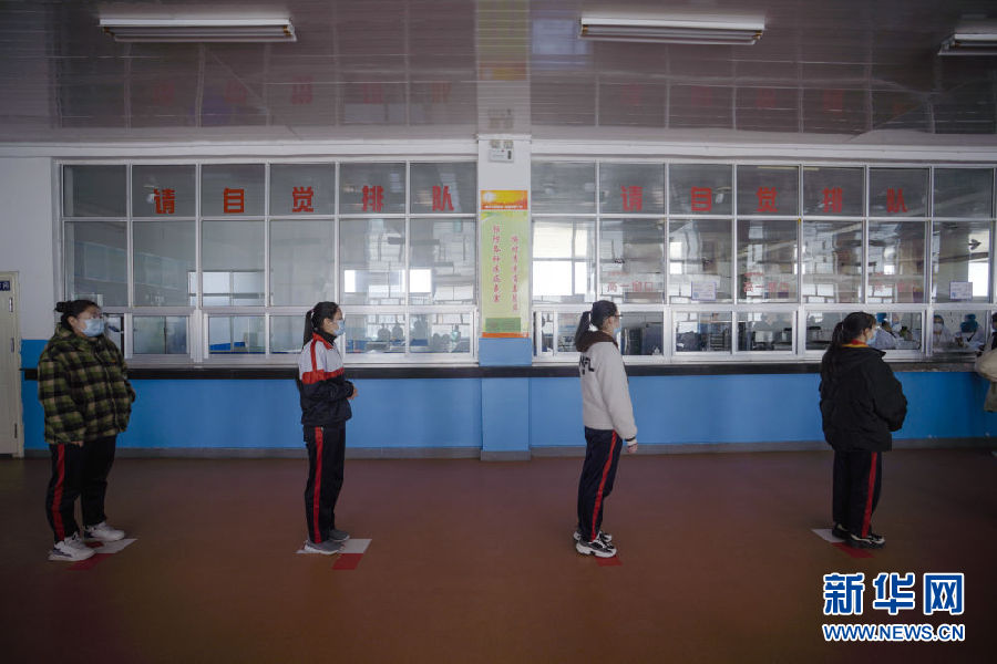 3月14日,海北州第一高級中學(xué)學(xué)生在餐廳排隊(duì)取餐。新華社 吳剛 攝