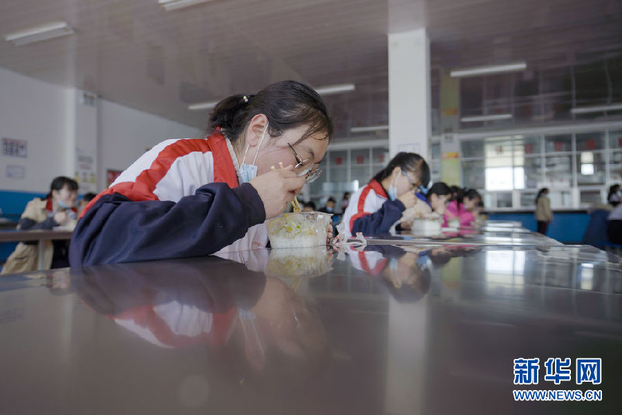 3月14日,海北州第一高級中學(xué)的學(xué)生正在餐廳分桌就餐。新華社 吳剛 攝