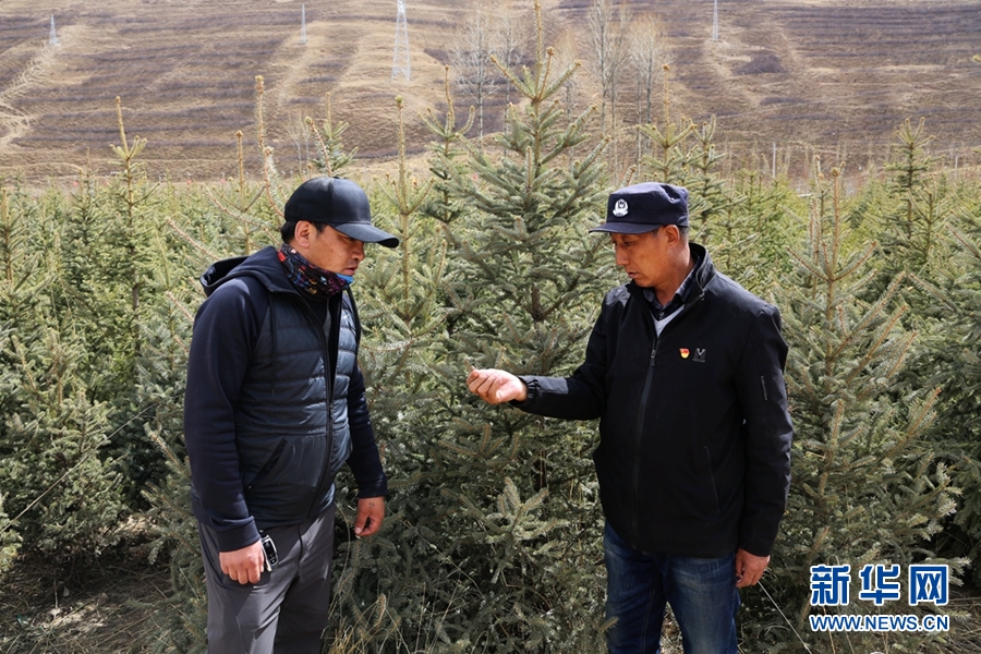 公保旦增(右)與扎巴江才正在查看樹木長勢情況。新華網(wǎng) 卡婭梅朵 攝