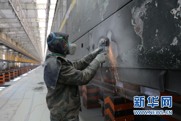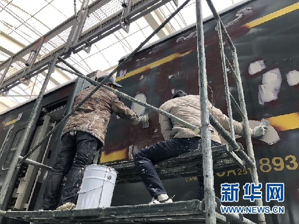 工人在對列車進行外皮打磨作業(yè)。新華網(wǎng)發(fā)