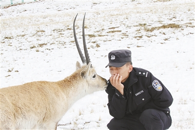 站在離它們不遠(yuǎn)的地方,相互平靜地對視,許久,一只小藏羚羊才走上前來,把臉慢慢靠近蹲在地上的才仁多杰的面頰。
