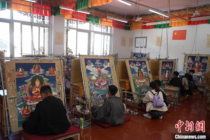 6月中旬,唐卡畫技能班里的學生們正在完成自己的畢業(yè)作品。中新社記者 劉忠俊 攝