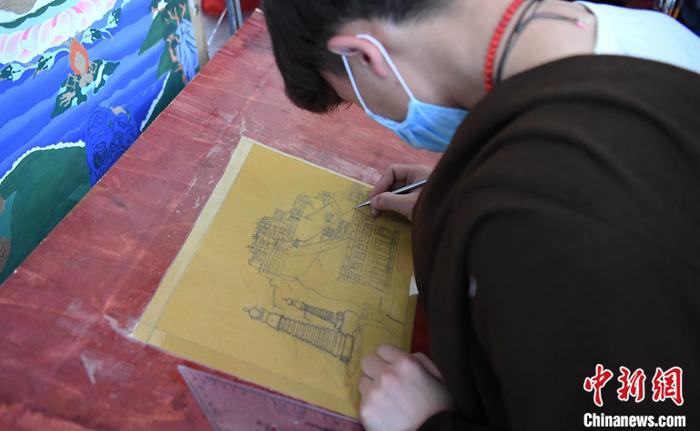 6月中旬,唐卡畫初級班里一名學生正在進行唐卡畫素描練習。中新社記者 劉忠俊 攝