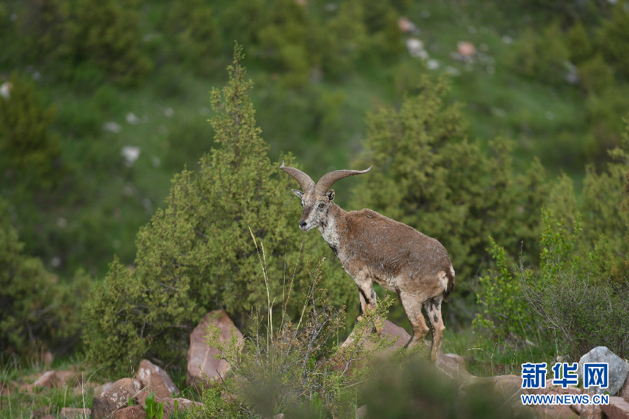 一只巖羊在囊謙縣吉尼賽鄉(xiāng)河谷的山坡上眺望。(6月20日攝)新華網(wǎng) 潘彬彬 攝