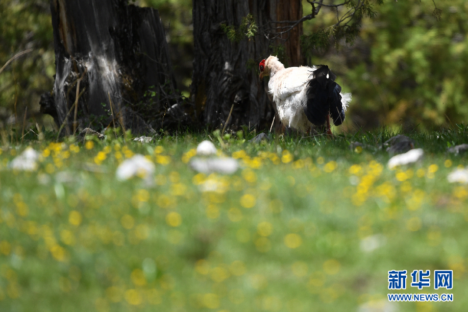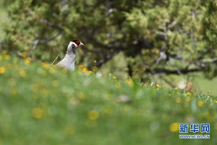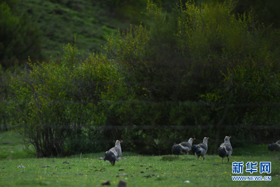 幾只白馬雞在囊謙縣吉尼賽鄉(xiāng)河谷的山坡上覓食。(6月20日攝)新華網(wǎng) 潘彬彬 攝