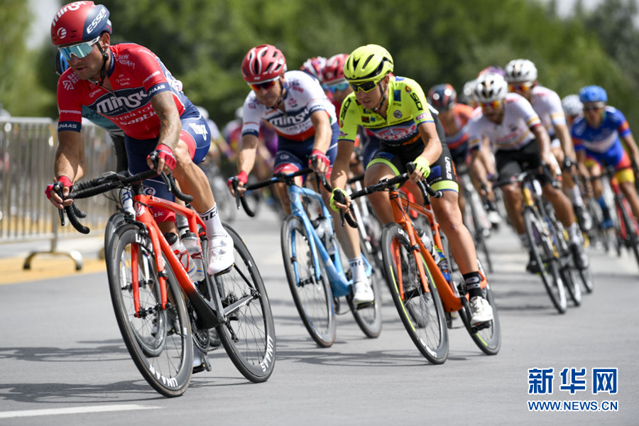 2019年7月27日,參賽車手在比賽中。當日,第十八屆環(huán)青海湖國際公路自行車賽結束最后一個賽段——寧夏銀川繞圈賽的角逐。新華社 馮開華 攝