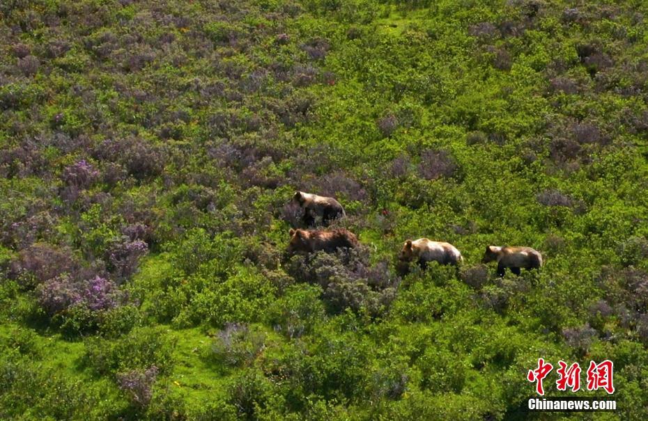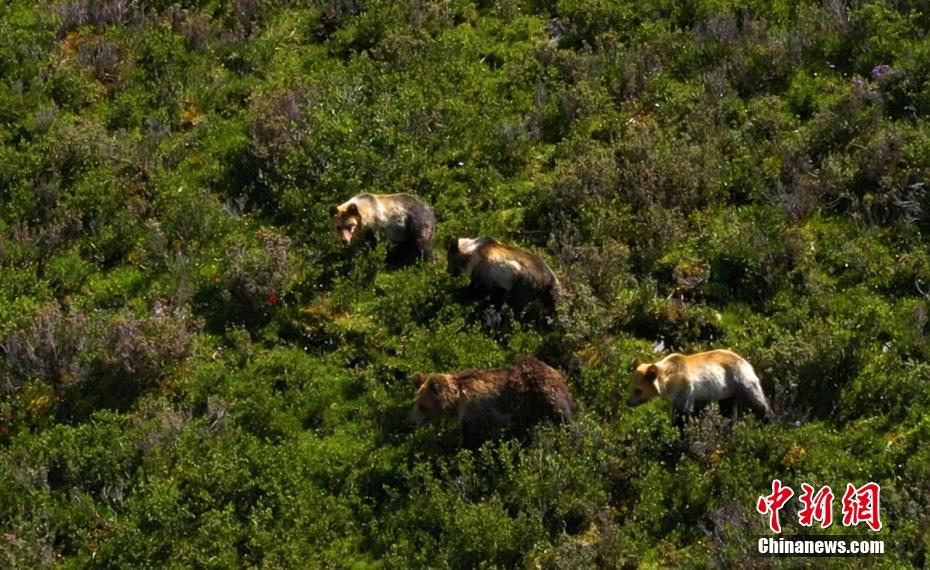 棕熊媽媽帶著3只熊寶寶行走在山坡上。秦晉翔 攝