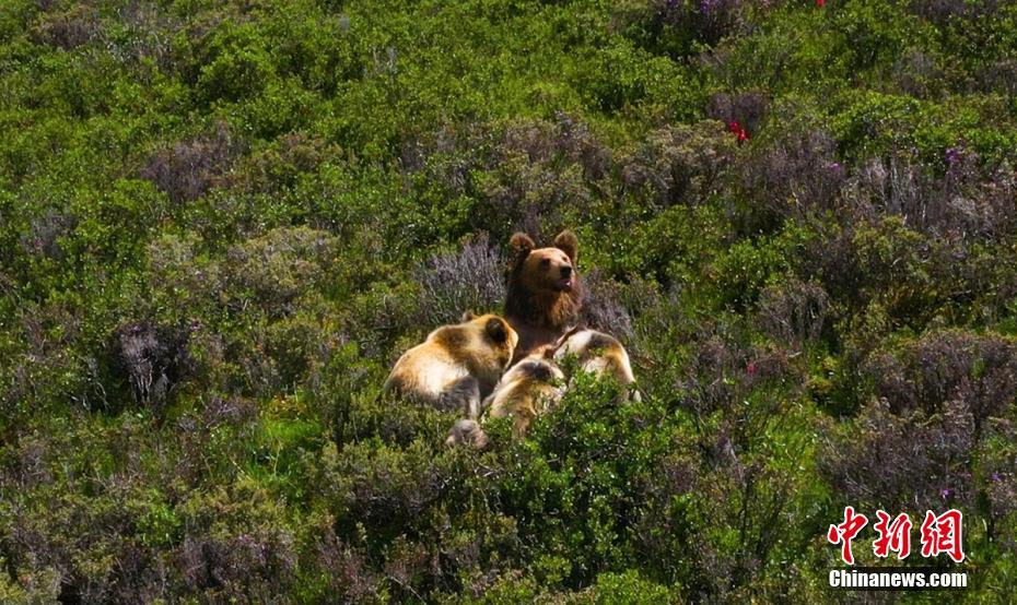 7月13日下午,記者下鄉(xiāng)采訪途中,在海拔4500米的四川省甘孜藏族自治州石渠縣蒙宜鎮(zhèn)蒙格村附近一處水草豐茂的山坡處拍攝時(shí),偶然發(fā)現(xiàn)一只棕熊媽媽曬著陽(yáng)光浴給三只小熊喂奶場(chǎng)景,棕熊媽媽喂奶結(jié)束后領(lǐng)著小熊寶寶們緩慢走向大山深處。
