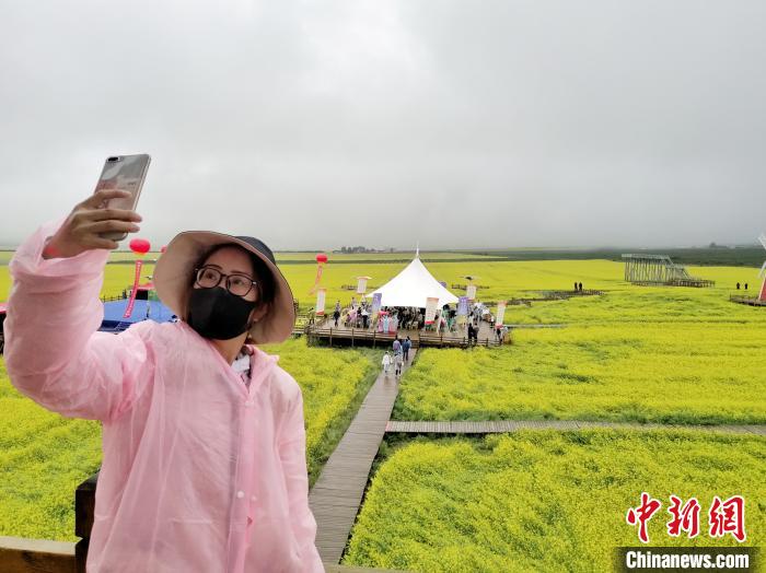 記者在油菜花海內(nèi)看到,雖然當天下著雨,仍然有前來游玩的游客,當?shù)厥忻褛w金花說,疫情后這是他們一家人第一次來油菜花海游玩,走在一望無際的花海里心情特別輕松。