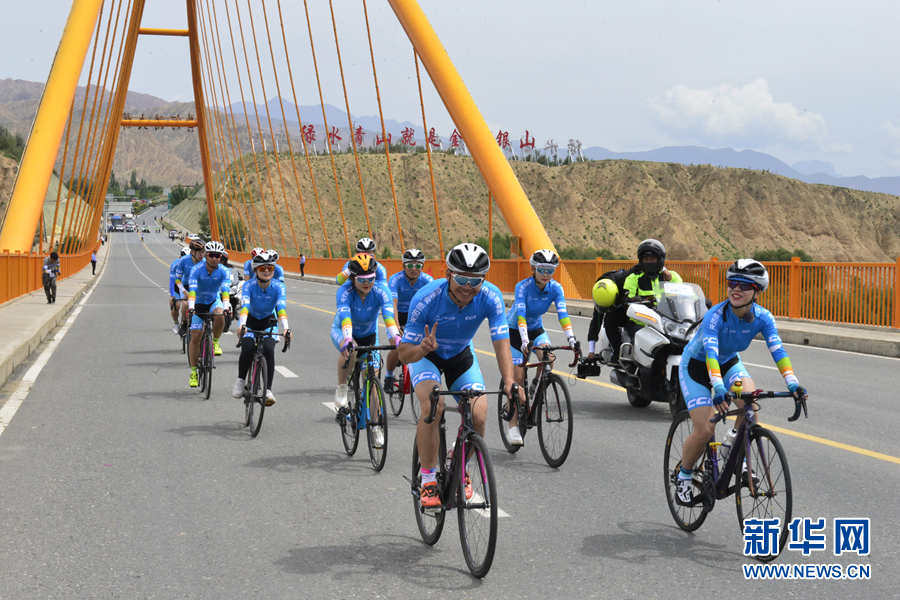 圖為“網(wǎng)紅”團(tuán)隊(duì)在貴德黃河大橋上騎行。新華網(wǎng) 魚(yú)昊 攝