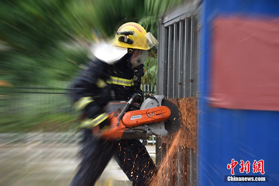圖為消防員利用無齒鋸對障礙物進行破拆。 婁淵燾 攝