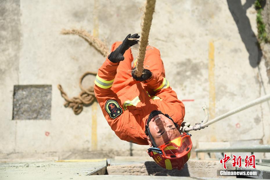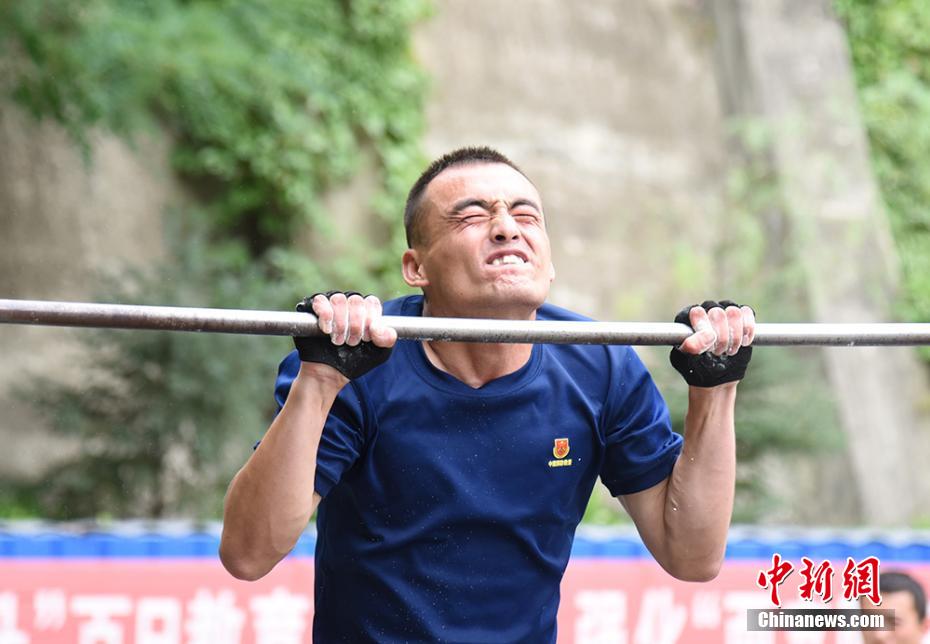圖為消防員摩拳擦掌,迎難而戰(zhàn),創(chuàng)造了單杠卷身上的新紀錄。 婁淵燾 攝